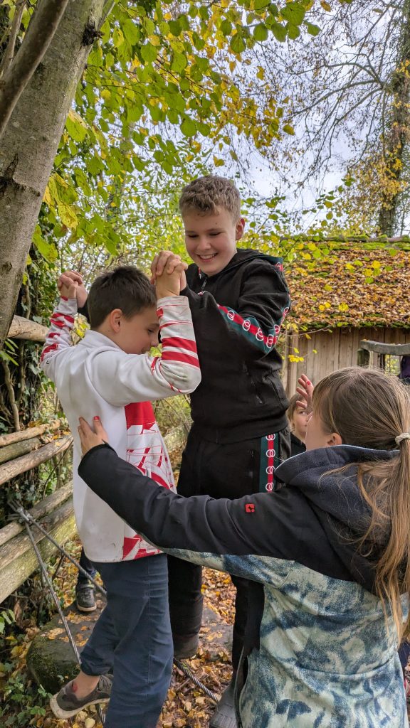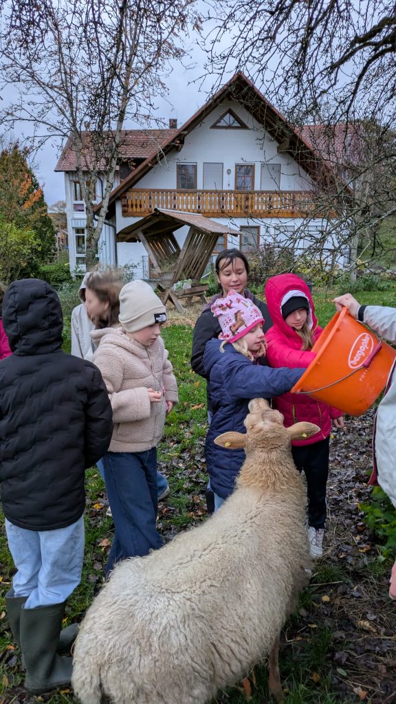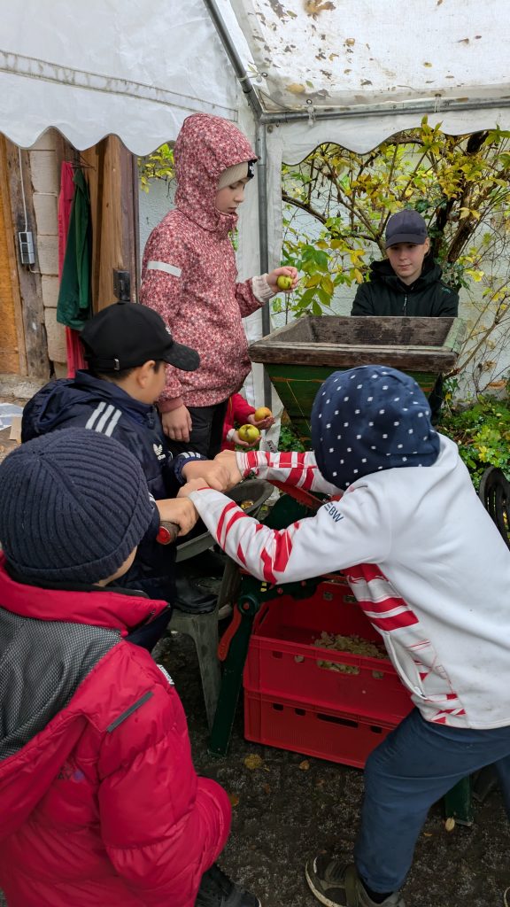 Jeden Morgen wurden zunächst die Tiere des Hofs versorgt: Kühe, Schafe, Hasen, Katzen, Huarizos und Schweine freuten sich über die Hilfe der Kinder. Anschließend stand das gemeinsames Frühstück auf dem Programm. Ein besonderes Highlight war das Sammeln von Äpfeln und das anschließende Pressen von eigenem, frischem Apfelsaft – natürlich mit Verkostung! Trotz des leider sehr regnerischen Wetters ließen sich alle die gute Laune nicht verderben. Die Schüler*innen konnten ihre Treffsicherheit beim Bogenschießen unter Beweis stellen und bei verschiedenen Spielen im Niederseilklettergarten Teamgeist und Vertrauen stärken. Am Lagerfeuer beim gemeinsamen Grillen konnten sich alle aufwärmen und den Tag gemütlich ausklingen lassen. Ein spannender Abschluss war die Nachtwanderung, bei der die Schüler*innen mit Taschenlampen und leuchtenden Augen die Umgebung der Burg erkundeten. Nach diesen erlebnisreichen Tagen kehrten alle müde, aber glücklich und mit vielen schönen Erinnerungen und neuen Freundschaften im Gepäck zurück.